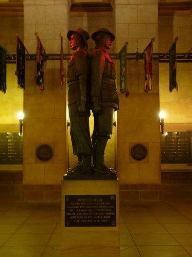 Beneath the Sanctuary lies the Crypt, which contains a moving, bronze statue of a father and son and panels listing every unit of the Australian Imperial Force. From the crypt, we went through into the Visitor Centre which contained pictures of the Shrine being built as well as a picture of the dedication ceremony performed by the Duke of Gloucester.